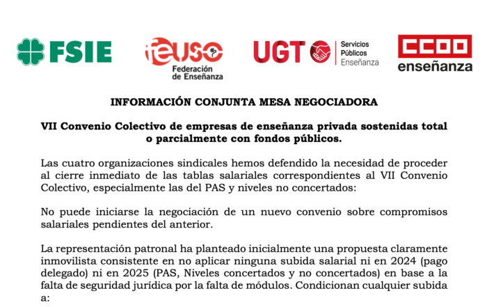 Las organizaciones sindicales presentes en la mesa negociadora del VII Convenio Colectivo de empresas de enseñanza privada sostenidas total o parcialmente con fondos públicos, entre ellas FEUSO, han defendido la necesidad de proceder al cierre inmediato de las tablas salariales pendientes, especialmente las correspondientes al PAS y a los niveles no concertados. Desde las organizaciones sindicales afirmamos que no puede iniciarse la negociación de un nuevo convenio mientras existan [...]