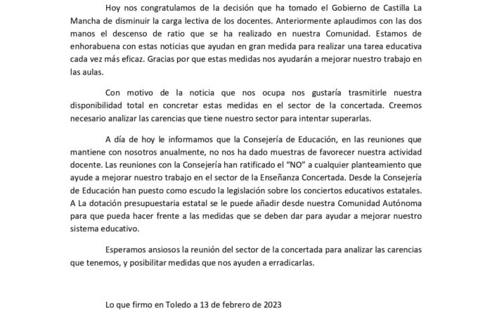 En el día de ayer, nos alegramos de la decisión que ha tomado el Gobierno de Castilla La Mancha de disminuir la carga lectiva de los docentes de la enseñanza pública y de mejorar [...]